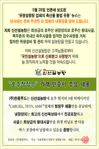 설농탕 재료에 대해서도 적극 해명했다. 신선설농탕 측은 “이번에 문제가 된 우족뿐 아니라 잡뼈조차도 일절 쓰지 않고 있으며 오로지 호주산 냉장양지, 호주산 왕대사골과 국내산 육우 사골만을 사용하고 있다”고 말했다.