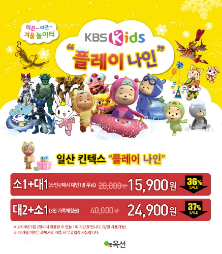 ‘KBS Kids 플레이나인’ 관계자는 "겨울방학을 맞아 부담 없는 가격으로 온 가족이 즐길 수 있도록 이번 프로모션을 준비했다"며 "최근 큰 이슈로 부상한 미세먼지와 추위를 피해 플레이나인에서 건강하고 쾌적한 겨울을 보내시길 바란다"고 전했다.