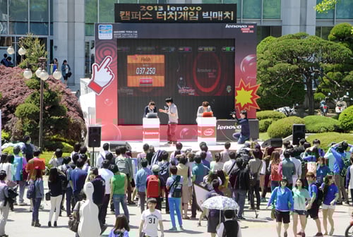 | ▲ ‘포스트 삼성’을 꿈꾸는 IT기업 레노버가 다양한 마케팅 활동을 펼치고 있다. 지난해 봄 서울 서대문구 신촌동 연세대학교에서 열린 ‘한국레노버 캠퍼스 터치게임 빅매치 시즌 2’에서 학생들이 게임을 즐기고 있다.(사진=머니투데이 최부석 기자) |
