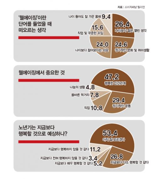 <머니위크>는 웰에이징에 대한 국민의 관심도를 알아보기 위해 소비자패널 틸리언에 의뢰, 전국 30대 이상 50대 이하 남녀 500명을 대상으로 설문조사를 실시했다(신뢰도 95%, 오차범위 ±4.38%, 조사기간:1월8~10일). 그 결과 응답자들은 행복한 노년기를 기대하고 있으며, 외면보다는 내면을 가꾸는 것을 웰에이징의 중요한 요소로 여기는 것으로 나타났다.
