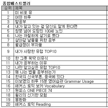 한편 종합1위는 독자들의 가슴을 적시는 조조 모예스의 소설 <미 비포 유>가 2주 연속 자리했고, 신준모의 SNS 에세이 <어떤 하루>가 지난주보다 한 계단 올라 2위를 기록했다.