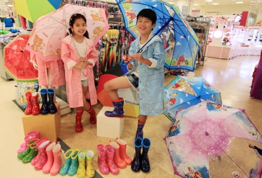 | 9일 오전 서울 중구에 위치한 이마트 청계천점 우산매장에서 아동들이 우비와 장화를 신고 장마용품을 선보이고 있다. /사진제공=이마트 |