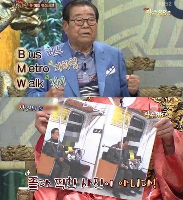 실제로 이날 송해는 대중교통을 이용하고 있는 모습이 담긴 사진을 공개해 ‘BMW’ 인증샷을 선보이기도 했다. 공개된 사진 속 송해는 지하철 노약자석에 앉아 고개를 숙이고 있어 “졸고 있는 것 아니냐”는 질문을 받았지만 “옆에 있는 사람에게 사인을 해주고 있었던 것”이라고 해명해 웃음을 자아냈다.