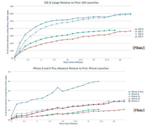 반면 iOS8을 사전탑재한 아이폰6는 아이폰5S보다 2배 높은 판매량을 보이고 있다. 아이폰6는 출시 17일만에 전체 아이폰 중 4%의 비중을 차지하고 있다. 아이폰6 플러스와 합하면 5%를 넘는다. 아이폰5S는 같은 기간 아이폰5C와 합쳐서 3%를 기록한 바 있다.