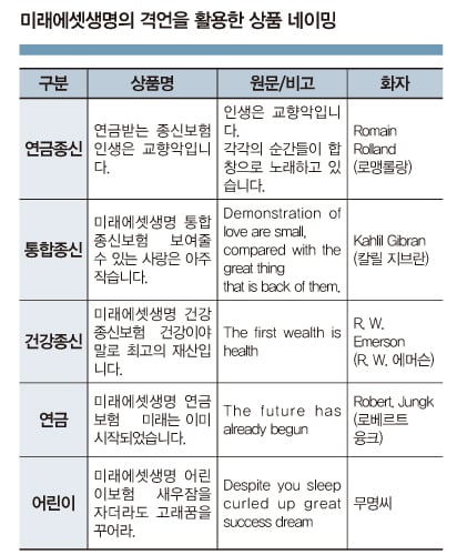 이 상관관계는 미래에셋생명이 앞서 시작한 격언 마케팅에서도 엿볼 수 있다. '건강이야말로 최고의 재산입니다'는 건강보험이고 '미래는 이미 시작되었습니다'는 연금보험이다.