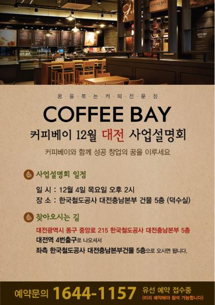 오는 12월 커피베이는 서울, 대전 사업설명회를 계획하고 있다. 대전사업설명회는 12월 4일 목요일 오후 2시 한국철도공사 대전충남본부 5층 덕수실에서 진행될 예정이다.