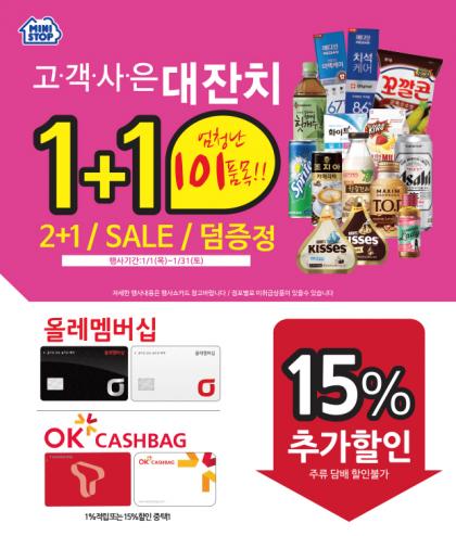 미니스톱은 1월 31일까지 ‘해피바스 바디오일’, ‘아트릭스 핸드크림’등의 화장품 10종, ‘포인트클렌징티슈’, ‘온더바디퍼퓸 바디워시’등 세면용품 24종, ‘자뎅 컵커피’ 전 품목 등 요즘처럼 추운 겨울 고객들이 많이 찾는 제품들을 위주로 총 101가지 품목을 선정하여 1+1 행사를 시행한다.
