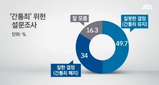 반면 간통죄 폐지를 긍정적으로 바라보는 여성은 22.6%에 불과했으며, 여성의 57.0%는 '잘못된 결정'이라고 생각하는 것으로 조사됐다. 간통죄 폐지에 대한 전체적인 의견으로는 '잘못한 결정'이라는 답변이 49.7%로 여전히 우세했으며, '잘한 결정'은 34%, '잘 모름'은 16.3%로 집계됐다.
