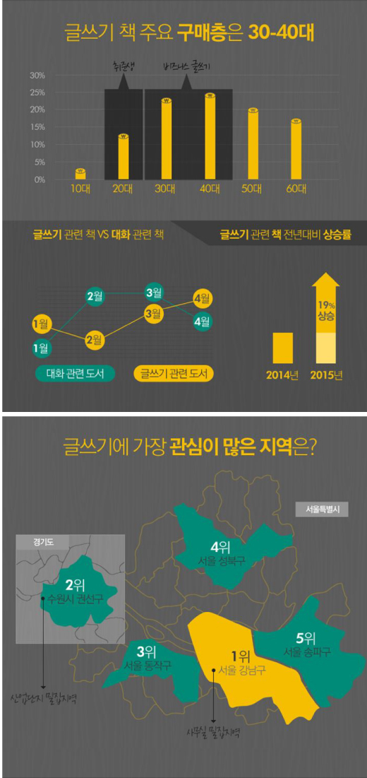 글쓰기 관련도서가 가장 많이 판매된 지역은 사무실이 밀집된 서울 강남구와 수원 제 1,2,3 산업단지가 밀집해 있는 수원시 권선구가 1, 2위를 차지했다.
