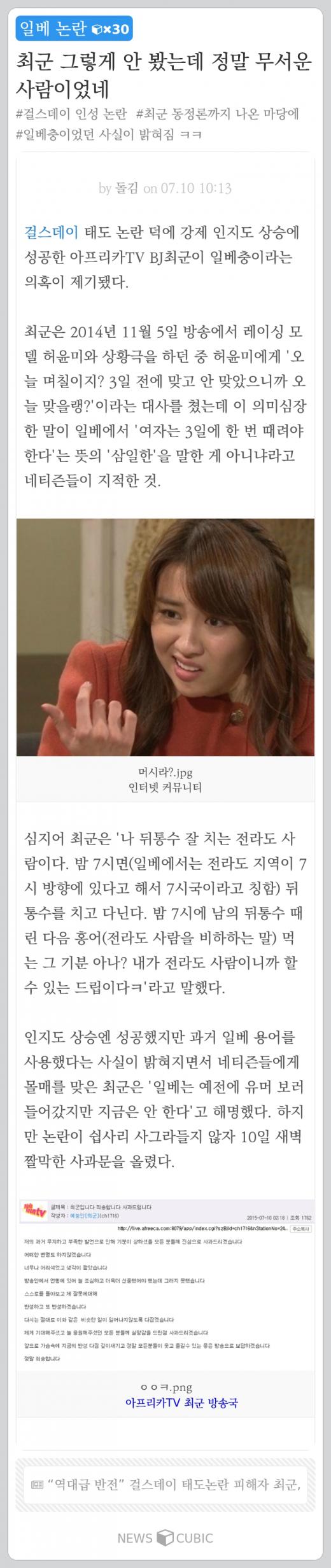 '걸스데이 인성 논란'으로 동정론까지 일었던 아프리카TV BJ 최군이 과거 일베 용어를 사용했다는 얘기가 나와 한 순간에 비판의 대상이 됐다. '여자는 3일에 한 번 때려야 한다'는 뜻의 '삼일한', 전라도 지역을 비하하는 의미의 '홍어'란 말을 쓴 사실이 밝혀지자 BJ 최군은 '지금은 일베에 접속하지 않는다'고 밝혔지만 이미 그에 대한 대중의 시선은 싸늘해진 상황이다.