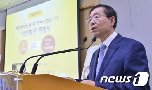 | 지난 10일 오전 박원순 서울시장이 서울시청 신청사 브리핑룸에서 열린 기자설명회에서 2016년도 예산안을 설명하고 있다. /사진=뉴스1 |
