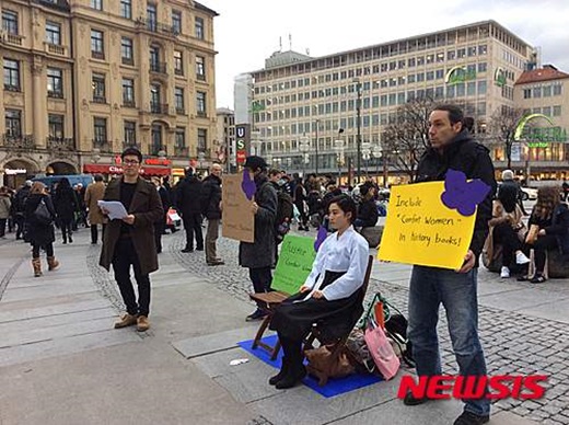퍼포먼스 참여자들은 이날 뮌헨 도심 한복판 칼츠플라츠 광장에서 치마저고리를 입고 소녀상과 똑같은 자세로 앉아있는 여성 옆에서 '역사교과서에 위안부 사실을 포함하라', '위안부 여성들을 위한 정의' 등의 문구가 쓰인 배너를 들고 시위를 벌였다.