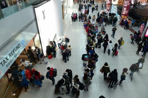 | 인천국제공항 여객터미널 면세구역에 설치된 세금환급소에 출국자들이 길게 줄을 서 있다/사진=뉴스1DB |