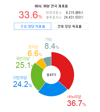 정당별 득표율은 ▲새누리당 36.7% ▲더불어민주당 24.2% ▲국민의당 25.1% ▲정의당 6.6% 등이다.