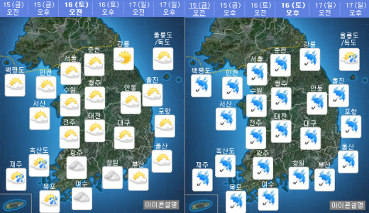 | 내일(16일) 오전·오후 날씨. /자료=기상청 |