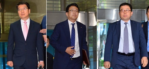 | 왼쪽부터 임형도 SK텔레콤 상무, 최영석 KT 상무, 강학주 LG유플러스 상무가 29일 오전 경기도 성남시 한국정보통신기술협회에서 진행되는 주파수 경매에 참가하기 위해 입장하고 있다. /사진=뉴스1 |
