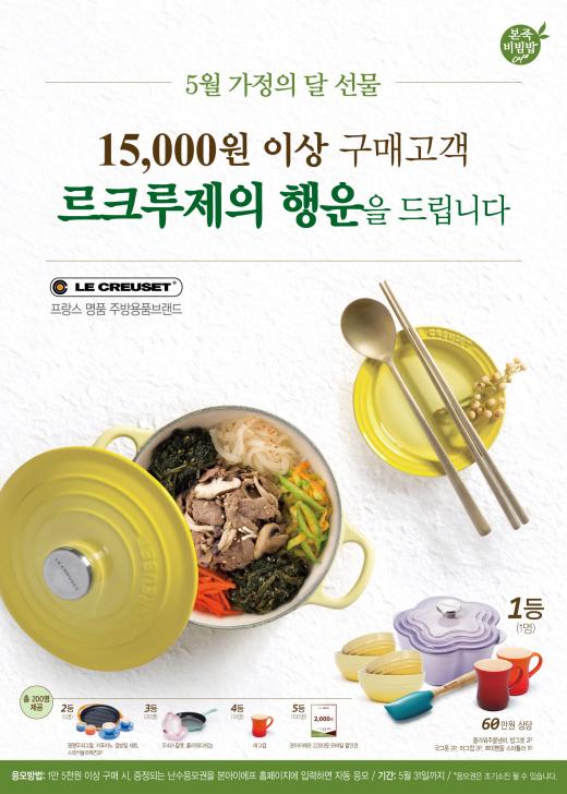 5월 가정의 달을 맞아 진행하는 이번 이벤트는 본죽&비빔밥카페 주 소비자 층인 30대 여성 고객에게 감사의 마음을 전하고자 주 이용 고객들이 좋아하는 주방용품 브랜드인 르크루제 브랜드를 특별히 선정해 진행하게 됐다.