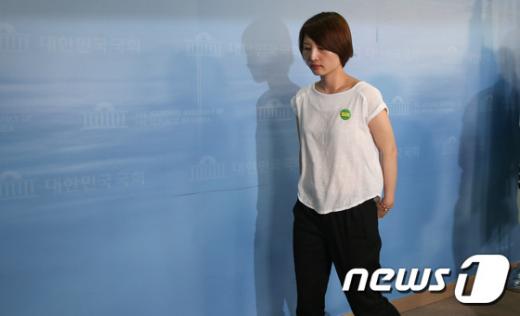 | 백남기. 야3당과 백남기 대책위 공동 기자회견을 마친 백남기씨의 딸 백도라지씨가 회견장을 나서고 있다. /사진=뉴스1 |