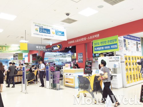 # “은행 영업점은 아니고 은행서비스를 제공하는 곳으로 알고 있어요. 스포츠전문점 쪽으로 가보시겠어요?” 은행업무 보는 곳이 있냐고 물어보자 이마트 직원이 이렇게 설명했다. 스포츠전문점 앞에는 ‘365일 편안한 은행업무’라고 적힌 플래카드가 걸려 있었다. 그 아래 3.3㎡도 채 되지 않는 공간에서 한국스탠다드차타드(SC)은행 직원이 고객을 기다리고 있었다. 눈여겨보지 않으면 지나칠 수 있는 작은 공간이다. 정확한 명칭은 ‘SC은행 뱅크데스크’. 이마트에 장을 보러 온 K대 재학생은 “이 시간(저녁 6시)에도 마트 안에 은행업무를 볼 수 있는 곳이 있는 줄 몰랐다”며 “이런 공간이 좀 더 알려지고 많이 생겼으면 좋겠다”고 말했다.