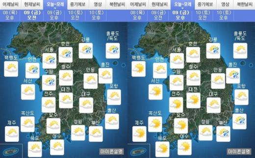 | 오늘(9일) 오전·오후 날씨. /자료=기상청 |