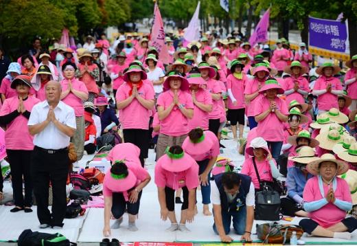 | 지난 8월25일 서울 여의도 산업은행 앞 백남기 농민 국회청문회 개최, 농민 생존권 쟁취, 2016 전국여성농민결의대회에서 여성농민 등 참석자들이 백남기 농민 청문회 개최와 생존권을 위한 100배를 하고 있다. /사진=뉴시스 |