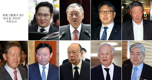 이날 국회에서 열리는 최순실 국조 1차 청문회에는 ▲이재용 삼성전자 부회장 ▲정몽구 현대자동차그룹 회장 ▲최태원 SK그룹 회장 ▲구본무 LG그룹 회장 ▲신동빈 롯데그룹 회장 ▲허창수 GS그룹 회장 ▲김승연 한화그룹 회장 ▲조양호 한진그룹 회장 ▲손경식 CJ그룹 회장 등 재계서열 상위 대기업총수 9명이 증인으로 출석한다.
