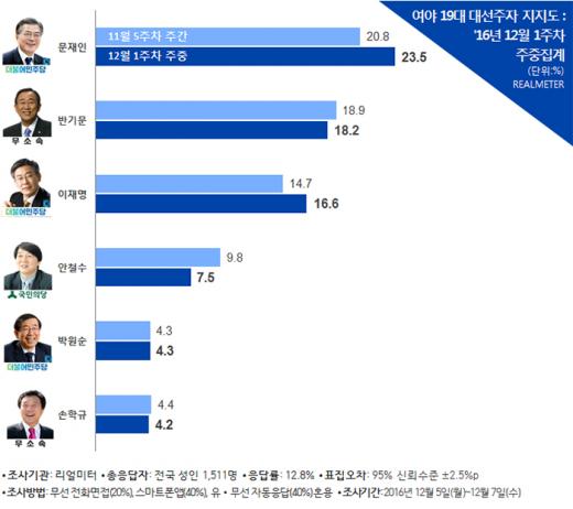 [차기 대선주자 지지율] 반기문-이재명 '초박빙'… 문재인 6주째 1위