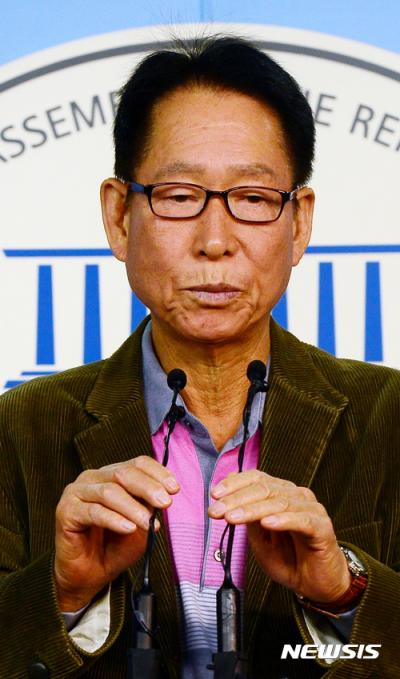 | 김해호 목사가 오늘(13일) 국회 정론관에서 박주민, 설훈, 유승희 민주당 의원과 함께 '공직 후보자 검증과 표현의 자유' 기자회견을 열고 있다. /사진=뉴시스 |