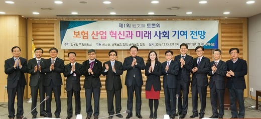 | ‘보험 산업 혁신과 미래 사회 기여 전망’이라는 주제로 토론회를 주최한 국회 정무위원회 소속 김성원 새누리당 김성원 의원(가운데)이 여의도 국회 의원회관에서 참석자들과 기념촬영을 하고 있다. |