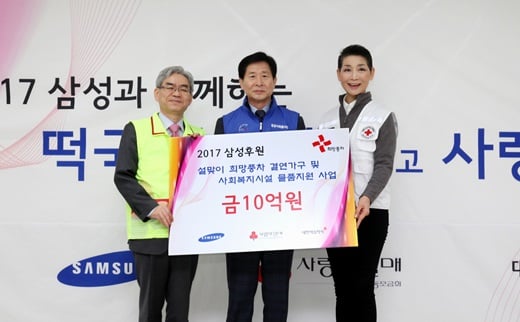 | 삼성이 11일 오전 서울 노원구 중랑노원희망나눔 봉사센터에서 설 명절을 앞두고 어려운 이웃들을 돕기 위한 기부금 10억원을 전달하고 있다. 사진은 윤주화 삼성사회봉사단 사장(가운데), 김성주 대한적십자사 총재(오른쪽), 박찬봉 사회복지공동모금회 사무총장(왼쪽)이 기념촬영을 하고 있는 모습. /사진=삼성 |