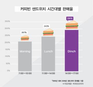 또 ‘커피빈코리아’가 최근 2개년 동안 샌드위치 판매수치를 분석한 결과 2016년 샌드위치 판매량이 2015년 대비 약 3.5배 증가, 특히 오후2시~5시 사이의 판매율이 약 4배로 가장 크게 상승해 점심과 저녁사이의 식사를 즐기는 딘치(Dinch)족의 판매가 늘어난것으로 나타났다.