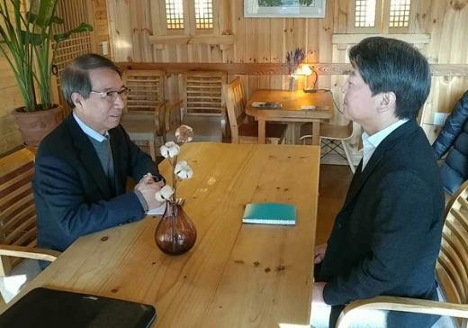 | 30일 오전 서울 모처에서 정운찬 전 국무총리(왼쪽)와 안철수 국민의당 전 대표가 만나 대화하고 있다. /사진=뉴시스(정운찬 전 국무총리 측 제공) |