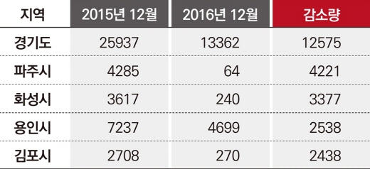 1일 업계와 국토교통부 통계누리 미분양현황 자료 등에 따르면 지난해 12월 기준 경기도 미분양 아파트는 총 1만3362가구로 전년 동기(2015년 12월) 2만5937가구 보다 1만2575가구 감소했다.