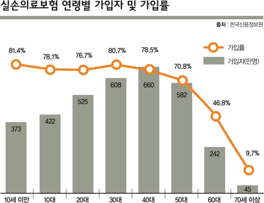 실손보험에 가입했더라도 매년 오르는 실손보험료는 노인에게 감당하기 버거운 수준이다. 70세 이상의 실손보험료는 월 평균 6만2000원으로 조사됐다.