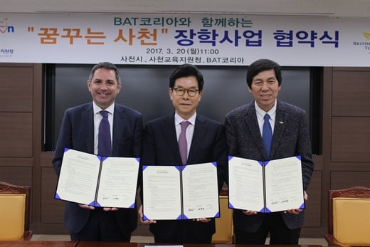 이날 사천시청에서 진행된 협약식에는 송도근 사천시장, 김정규 사천교육지원청 교육장, 토니 헤이워드 BAT코리아 사장이 자리를 함께했다. 이들은 사천시 인재육성을 위한 다양한 장학사업에 적극적으로 협력하기로 했다.