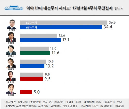 대선 후보 지지율 여론조사 결과가 발표됐다. 리얼미터는 오늘(27일) 3월 4주차 대선 후보 지지율 여론조사 주간동향 결과를 발표했다.