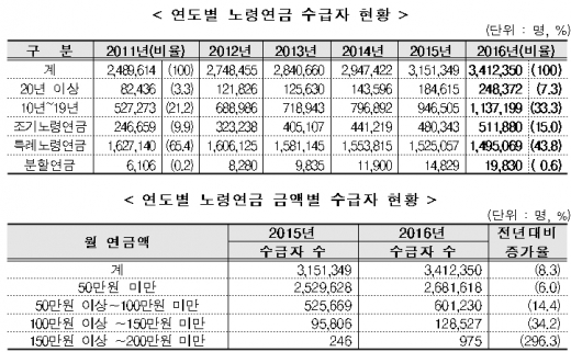 20년 이상 가입한 노령연금수급자는 25만명으로 전년대비 34.5%(6만4000명)증가했고 이들은 매월 평균 88만원의 연금을 받고 있다. 월 100만원 이상 수급자는 12만9000명으로 전년대비 34.8% 증가했으며 150만원이상 수급자는 975명으로 전년대비 296.3% 급증했다.