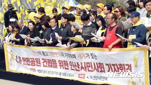 안산지역 시민사회단체 70곳으로 구성된 4·16안산시민연대(이하 시민연대)는 세월호참사 3주기인 16일 안산시 정부합동분향소 앞에서 기자회견을 열고 "다음달 말까지 화랑유원지 4·16안전공원(가칭) 조성을 위한 서명운동을 벌이겠다"고 밝혔다.
