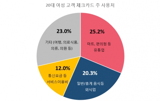20대 여성 고객이 체크카드를 가장 많이 사용한 곳은 편의점, 마트 등 유통업종(25.2%)인 것으로 나타났다. 이와 함께 일반 음식점 등 외식업(20.3%), 통신요금 납부 등 서비스 이용비(12%)가 뒤를 이었다.