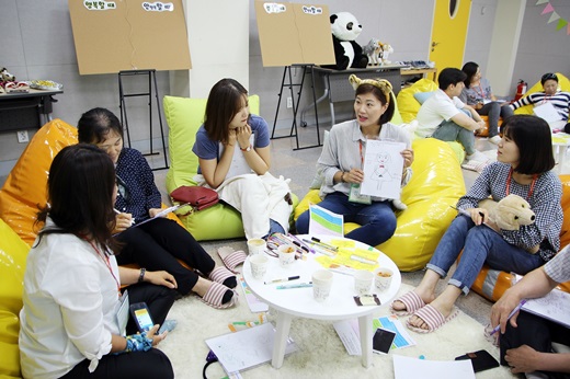 | 지난 29일 ‘비타민 캠프’에 참여한 용인지역 사회복지사들이 강의실에서 각자의 스트레스 원인을 진단하고 팀원들과 공유하고 있다. /사진=삼성전자 |