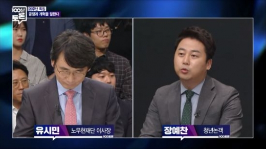 | 유시민 노무현재단 이사장과 장예찬 청년 논객. /사진=MBC '100분토론' 방송화면 캡처 |