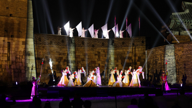 | 화서문과 서북공심돈에서 경기도무용단의 실경(實景) 공연으로 펼쳐진 ‘만천명월 태평서곡’공연 모습. / 사진제공=수원시 |