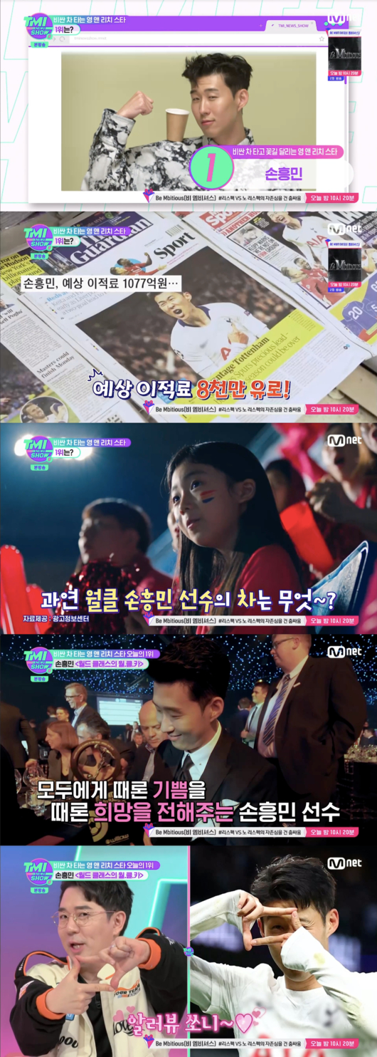 지난 25일 방송된 Mnet 예능 'TMI NEWS SHOW' 14회에서는 비싼 차를 타는 영앤리치 스타들의 순위를 살펴봤다. 붐은 "'비싼 차 타는 영 앤 리치 스타' 1위는 손흥민 선수"라고 언급했다.