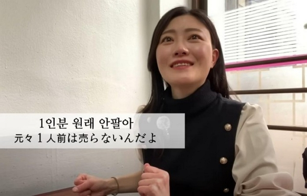 가게 문을 열고 들어간 아유미는 남성 사장에게 1명이라고 했고 사장은 "1인분은 안 된다"며 단호하게 말했다. 이에 아유미가 "2인분을 달라"고 하자 사장은 "거기 앉으라"며 한숨을 내쉬었다.