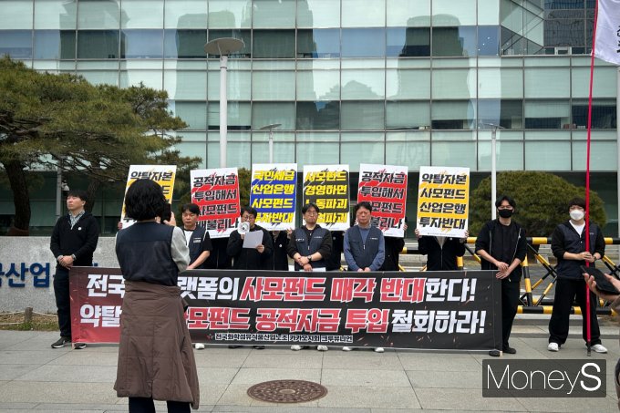 이날 현장에는 크루유니언 조합원 10여명이 참석해 피켓을 들고 구호를 외쳤다. 피켓에는 ▲약탈자본 사모펀드 산업은행 투자 반대 ▲공적자금 투입해서 사모펀드 배불리나 ▲사모펀드 경영하면 노동파괴 기업파괴 등의 문구가 적혔다.