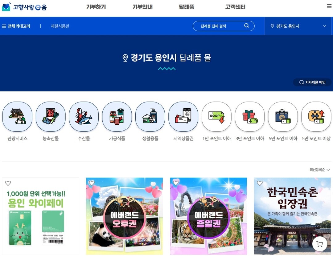 고향사랑기부제의 활성화를 위해 시가 답례품으로 추가한 상품은 지역 대표 관광 명소인 에버랜드와 한국민속촌 입장권, 에버랜드 인기 캐릭터 상품, 지역내 기업 '아토양조장'의 전통주 세트다.