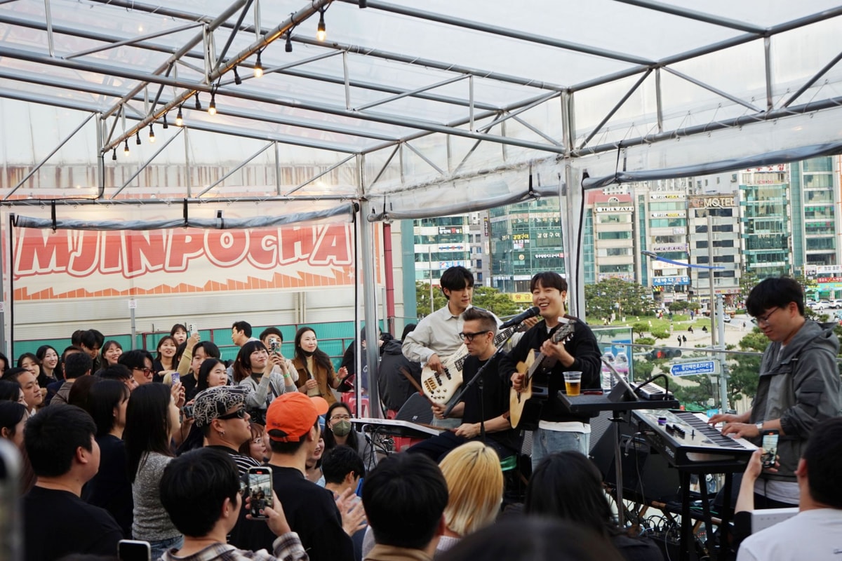 가수 장범준이 부산 광안리 인기 명소 '삼진포차'에서 두번째 깜짝 버스킹을 진행했다.