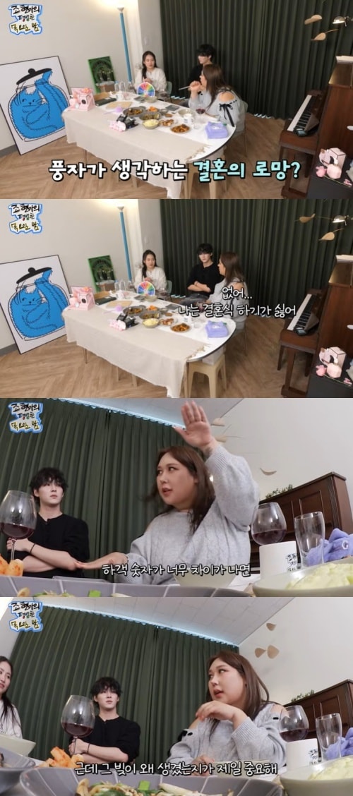이 자리에서 풍자가 "결혼에 관한 로망 있어?"라는 질문을 받고 "없어. 난 결혼식 하기가 싫어"라고 답했다. 그 이유에 대해서는 "비연예인과 결혼하게 된다면 안 할 것 같아. 하객 숫자가 많이 차이 나면, 그게 약간 미안할 것 같아"라며 "난 확실히 하객 수가 많을 거 아니야? 만약 미래의 그분이 없으면 안 할 것"이라고 설명했다.