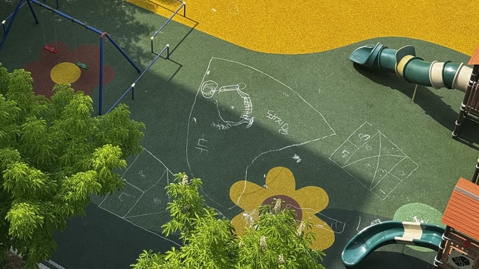 글쓴이 A씨가 공개한 카카오톡 대화방에서 입주민 B씨는 "어제 산책하면서 낙서하는 거 봤는데 오늘 다시 보니 역시나 안 지우고 갔네요"라며 아이들이 놀이터 바닥에 낙서해 둔 것을 찍어 올렸다. 아이들은 바닥에 땅따먹기(사방치기) 놀이판을 그려놓거나 '돼지맨' 등의 낙서를 끄적여놨다.