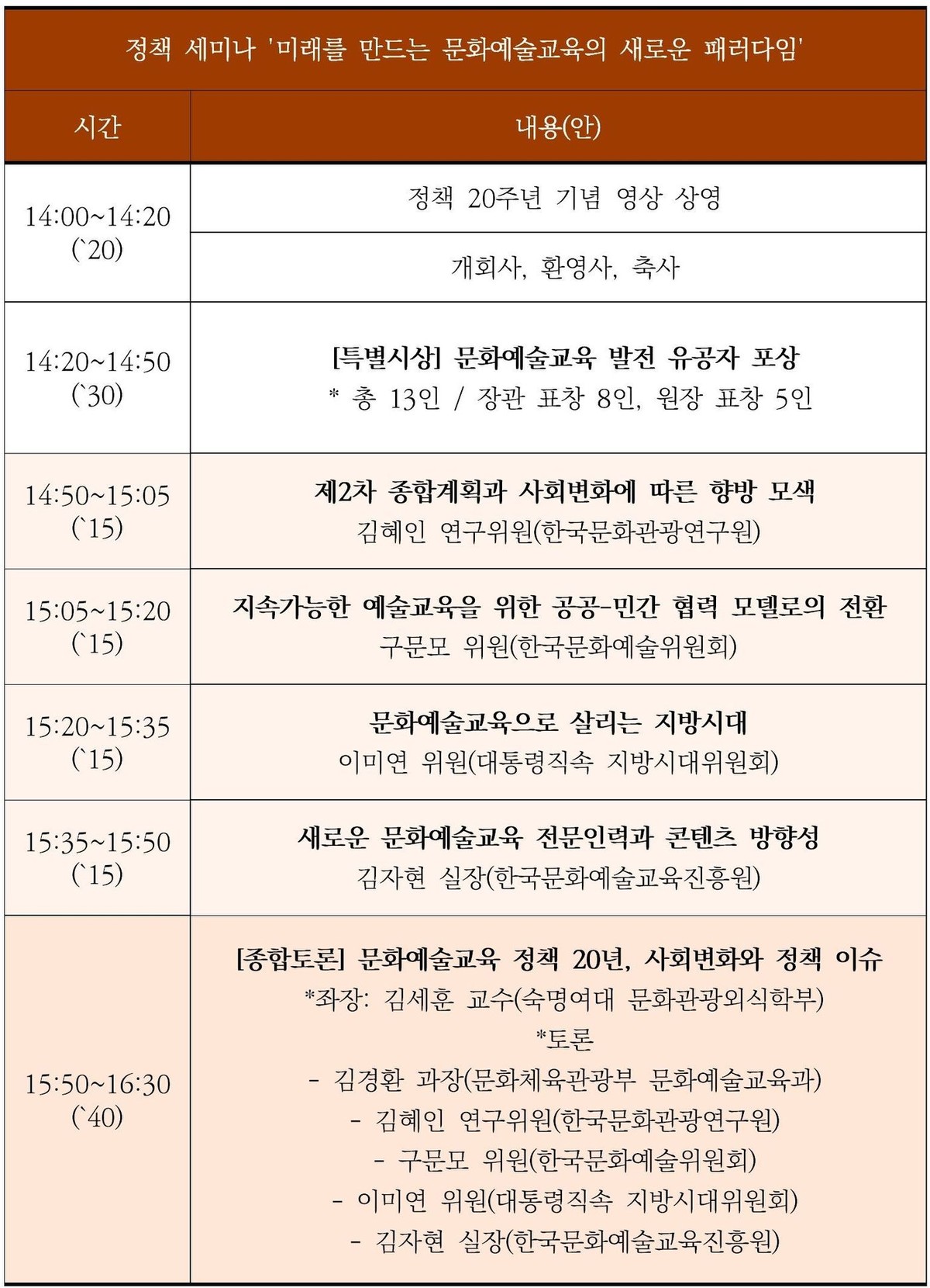 정책 세미나는 한국문화관광연구원 김혜인 연구위원의 제2차 문화예술교육 종합계확과 사회 변화에 따른 향방을 찾는 내용을 발표한다.